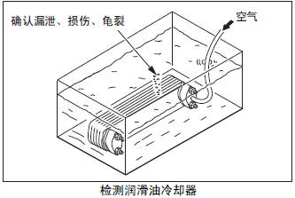 在三菱S6R發(fā)動機冷卻器芯的潤滑油通道部位,進行1.5MPa{15 kgf/cm2} 的壓縮空氣測試,檢查芯部的損傷或龜裂。發(fā)現(xiàn)有漏泄時,更換新的冷卻器芯。