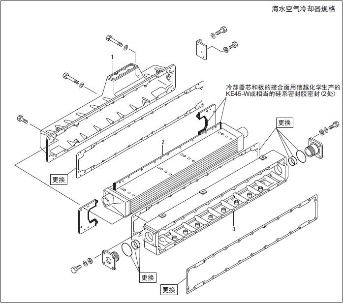 使用清水和使用海水的三菱S6R發動機空氣冷卻器的材質和結構是不同的,處理時要予以注意。本型機器使用清水冷卻器。
