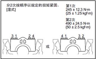 (5) 三菱S6R柴油發(fā)動(dòng)機(jī)曲軸最后端部除外的三菱S6R柴油發(fā)動(dòng)機(jī)主軸承瓦端蓋螺栓按照圖示順序,在規(guī)定扭矩的1/2 處一旦緊固。