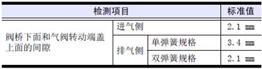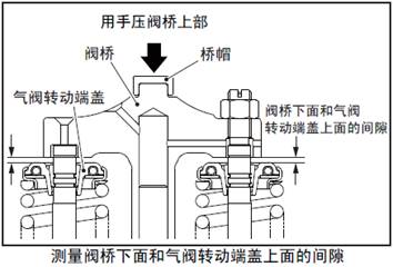 用手按壓閥橋,使和閥桿上端面接觸,檢測(cè)閥橋下面和三菱S6R柴油發(fā)動(dòng)機(jī)氣閥門(mén)轉(zhuǎn)動(dòng)端蓋上面的間隙。間隙超過(guò)標(biāo)準(zhǔn)值范圍時(shí),確認(rèn)故障的部件后更換新品。