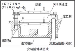 (2) 三菱S6R柴油發(fā)動(dòng)機(jī)搖臂軸的銷(xiāo)孔和定位銷(xiāo)對(duì)準(zhǔn)后,將搖臂總成安裝在搖臂箱體上。