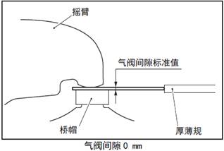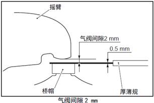 (2) 在搖臂和橋帽之間插入和三菱S6R柴油發動機氣閥門間隙標準值相同厚度的厚薄規。( 三菱S6R柴油發動機氣閥門間隙0 mm)