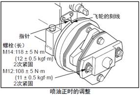 (4) 再次緩慢地正向盤車,使減振器上的規定噴油正時刻線和發動機的指針一致。這時,確認三菱S6R柴油發動機燃油噴油泵三菱S6R柴油發動機飛輪的記號「0」刻線和指針一致。不一致時,反復實施(2) 項。
