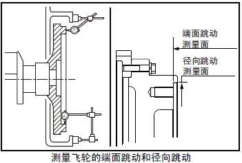 測量三菱S12柴油發動機飛輪的端面跳動、徑向跳動。超過標準值時,檢查螺栓的緊固狀況、安裝面有無異物粘附等組裝狀態。