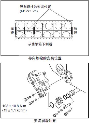 (3) 在三菱S12柴油發動機缸體安裝2 個導向螺栓,安裝油底殼。