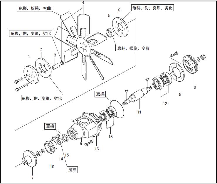 檢測(cè)三菱S12柴油發(fā)動(dòng)機(jī)風(fēng)扇驅(qū)動(dòng)軸和驅(qū)動(dòng)器殼體的軸承安裝部位,嚴(yán)重磨損時(shí)更換新品。
