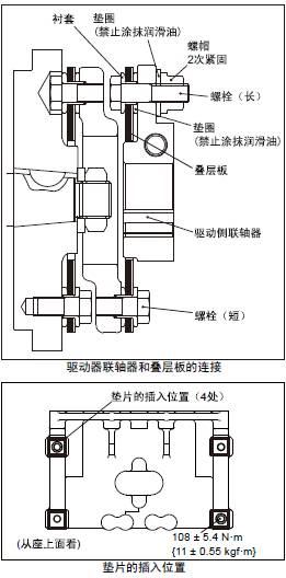(c) 驅(qū)動(dòng)器聯(lián)軸器和疊層板的配合面如有雜質(zhì)嵌入會(huì)引起打滑或損傷,使用前螺栓、襯套和墊圈要清洗干凈。