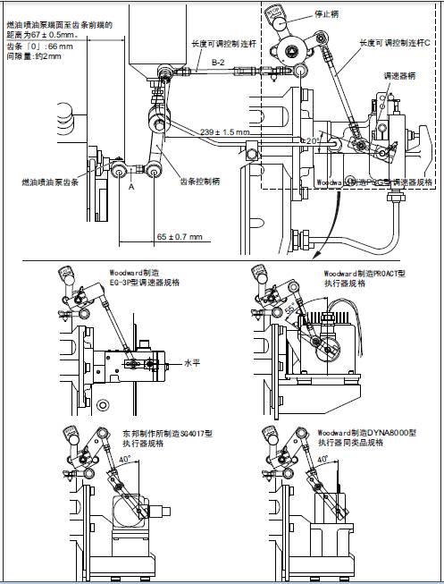 (3) 左氣缸側(cè)用可調(diào)長(zhǎng)度控制三菱R16柴油發(fā)動(dòng)機(jī)連桿B-2 調(diào)整至239 mm 臨時(shí)鎖緊,和有鋸齒孔的停止柄連接。確認(rèn)兩氣缸側(cè)的三菱R16柴油發(fā)動(dòng)機(jī)燃油噴油泵齒條處于「0」位置,油門柄和套管、回程彈簧一起和控制軸的鋸齒孔連接。
