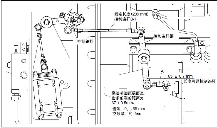 (5) 控制軸柄和調(diào)速器柄之間安裝可調(diào)長(zhǎng)度控制三菱R16柴油發(fā)動(dòng)機(jī)連桿。調(diào)速器執(zhí)行器輸出軸的角度刻度「0」( 不噴油位置) 時(shí),作微調(diào)整使噴油泵端面至齒條前端的距離為67 mm。