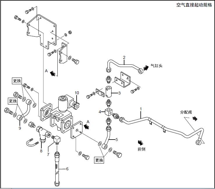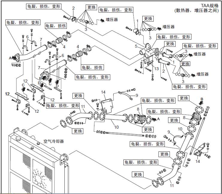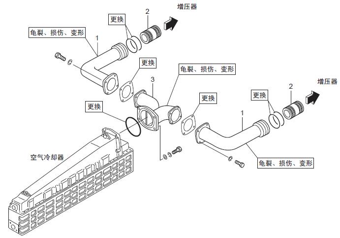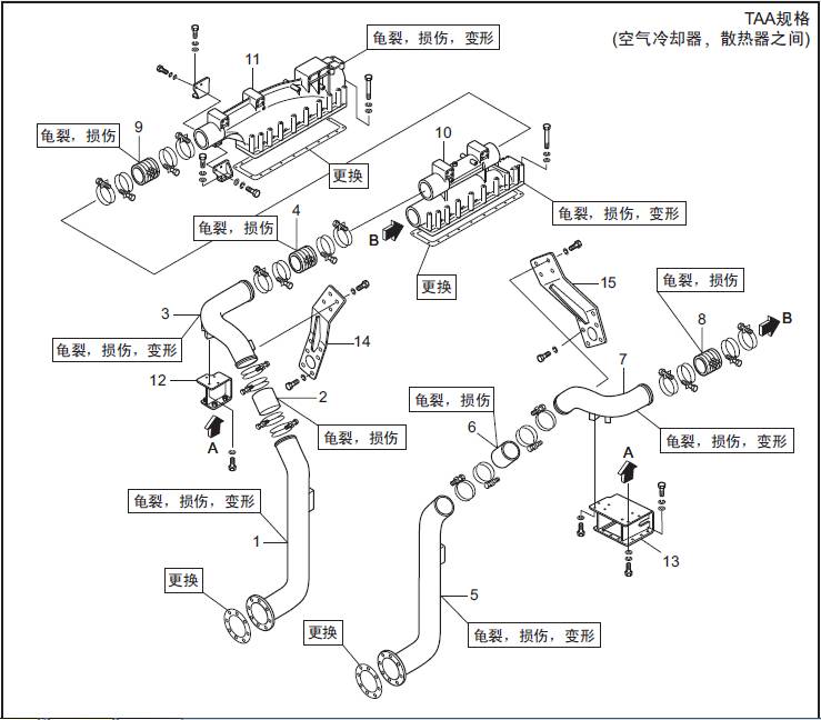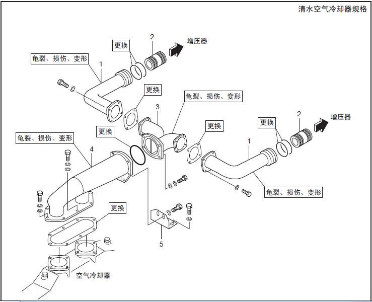 TAA規格(三菱S16柴油機空氣冷卻器、三菱R16柴油發動機三菱R16柴油發動機缸體之間) 空氣管的拆卸,檢修