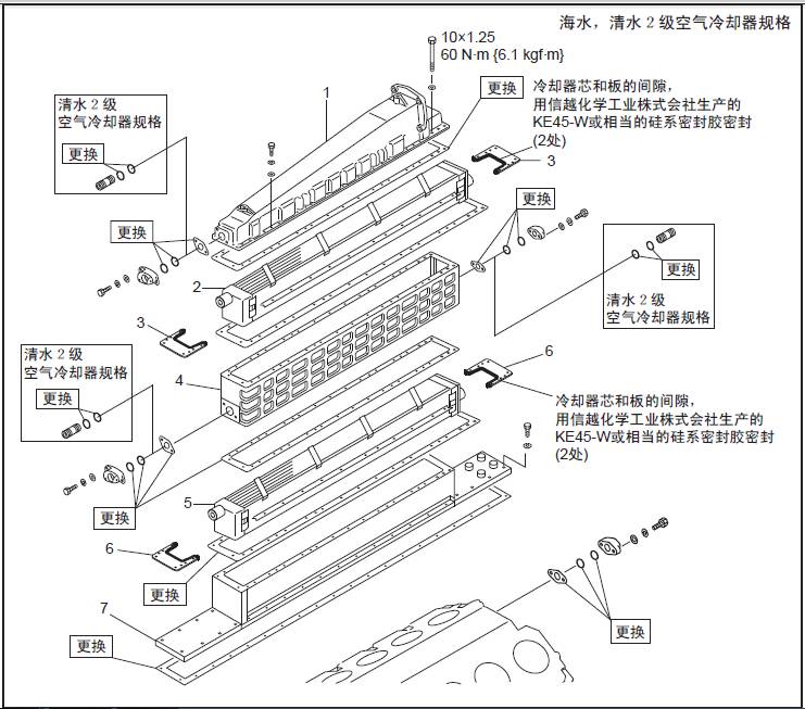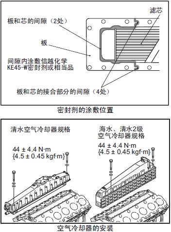 冷卻器芯和板之間的間隙,用信越化學工業株式會社生產的KE45-W 或相當的硅系密封膠密封。