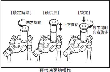 (3) 從放氣塞內排出的燃油不含有氣泡時旋緊塞頭,但在旋緊最后的1個放氣塞前,先將預供油油泵的端蓋壓下向右旋回至原狀鎖定。