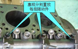 作功: 另一只缸蓋處于做功狀態,兩只氣門關閉,推桿處于最低位置,此時凸輪軸處于下八字,可調整氣門間隙。