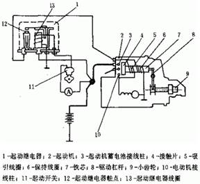 如果齒輪與飛輪齒端相對,不能馬上嚙合,此時彈簧壓縮,當齒輪轉過一個角度后,齒輪與飛輪迅速嚙合。當鐵芯移動到使短路開關閉合的位置時,短路線路接通,吸引線圈被短路,失去作用,保持線圈所產生的磁力足以維持鐵芯處于開關吸合的位置。