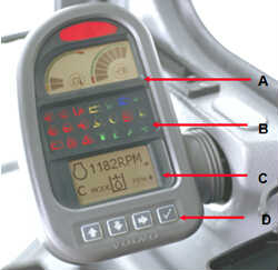 液壓剪選擇指示燈 C :MCD (信息中心顯示器)——轉速, 設置模式,故障代碼 D :滾動/確認按鈕