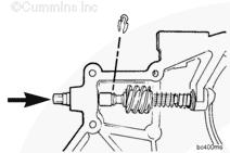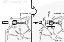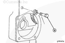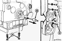 能夠拆下康明斯KTA柴油發(fā)動(dòng)機(jī)齒輪室蓋前必須先拆下主定位銷。使用滑錘 (33) 或 5/16-18 in 螺釘或螺桿和舊活塞銷拆下定位銷。前蓋的底部 (34) 上有 5 個(gè)螺釘,背部 (35) 上有 3 個(gè)螺釘。拆下底部螺釘 (34) 和后面的螺釘 (35)。
