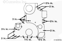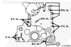 圖中所示為所有鑄鐵兩件式(船用)前齒輪室蓋的通用螺釘長度要求。(1) 至 (9) 的螺釘長度取決于所用的選裝件。所有螺釘都以美制英寸為單位。所有螺釘都為 3/8 x 16 UNC。
