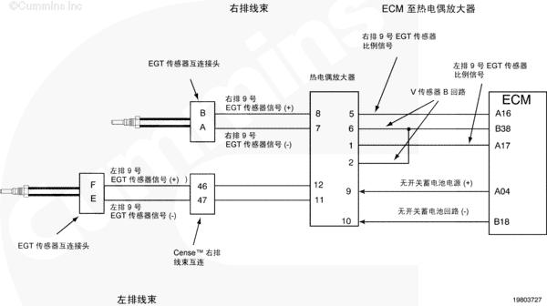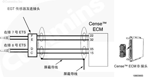 當鑰匙處于 ON(接通)或者康明斯發動機運轉時,可以使用 Insite™ 來監測排氣溫度傳感器的溫度值以快速檢查電路圖工作情況。有三個傳感器連接到右排線束上的一個接頭。為了進行系統快速檢查,從有故障代碼的傳感器上斷開傳感器接頭。INSITE™ 讀取到的所有傳感器溫度,除了 9 號排氣溫度傳感器之外,都應為非常低。如果斷開了與 7 號和 8 號排氣溫度傳感器相關的接頭,則 9 號排氣溫度傳感器讀取到的溫度值會非常高。短接每個傳感器的傳感器觸針“排氣溫度傳感器信號(正極)和排氣溫度傳感器信號(負極)”。Insite™ 中新的冷連接點處同一接頭上的傳感器的溫度讀數都將近似相同。這表示線束、熱電偶放大器和 CENSE™ ECM 正常工作,但傳感器有故障。如果接頭、線束、熱電偶放大器或者 CENSE™ ECM 有間歇性、故障或者腐蝕的連接,則有故障代碼的排氣溫度傳感器的溫度值響應將不會如上所述。將需要對系統的其余部分進行故障診斷以確定有故障的部件。該過程假定同一個傳感器接頭上的所有三個傳感器都沒有故障代碼。