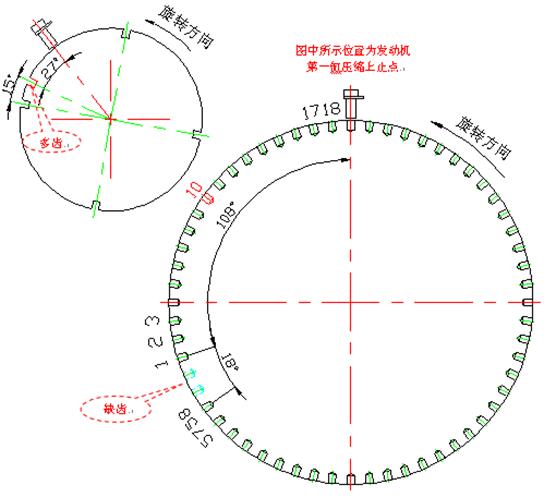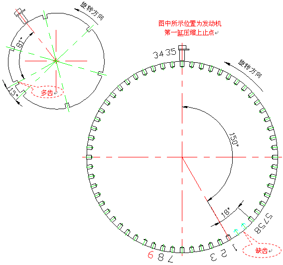 Ø 凸輪軸傳感器對準凸輪信號盤的多齒時,曲軸傳感器應對準曲軸信號盤缺齒后的第9齒,反過來不一定有這種關系。