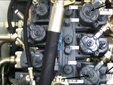 按下控制屏上“F3”鍵,把馬達轉速測量工裝吸到行走馬達上,把測線接到測試儀上,斜推 操縱桿,使左,右馬達分別正轉,測轉速應為12轉。使左右馬達分別反轉,測轉速應為12轉。若轉速達不到要求,則調節左右馬達控制閥塊螺釘,如下圖。