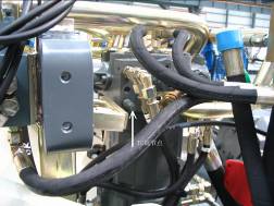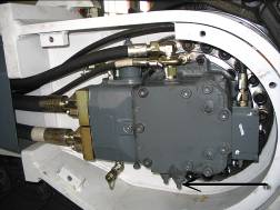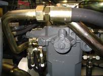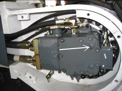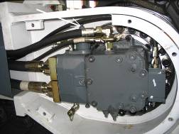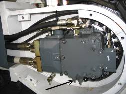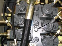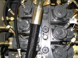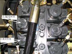 斷開回轉馬達制動油口,如下圖。在斷開的油管上接一測口,在斷開的馬達接頭處接堵頭。