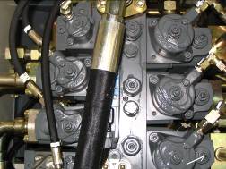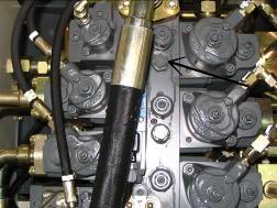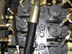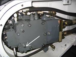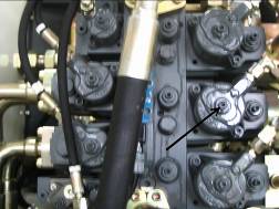 按下控制屏上“F3”鍵,快速回收鏟斗,讀出回油壓力,應為90--100 bar,如果達不到,就調工作閥塊第二個黑六角螺釘,如下圖。