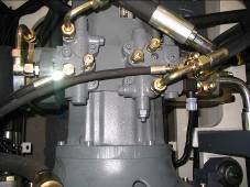 踩后退踏板,調左行走制動閥下面的黑六角螺釘,使左行走制動閥上兩個測口壓力為23 bar。調右行走制動閥上面的黑六角螺釘,使右行走制動閥上兩個測口壓力為23 bar。如下圖。