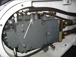 向斜上方推行走操縱桿到頭,測壓力應為350 bar ,先導壓力為0 bar。否則調節行走換檔閥塊右邊的調節螺釘。如下圖。
