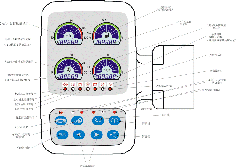 18、按鍵功能切換檢測:按動FUN按鍵,儀表將在工作小時數和機油壓力精確值之間切換顯示,當處于機油壓力精確值顯示時,按動左鍵或右鍵也能實現工作小時數和機油壓力精確值之間的切換功能,說明儀表功能按鍵正常。