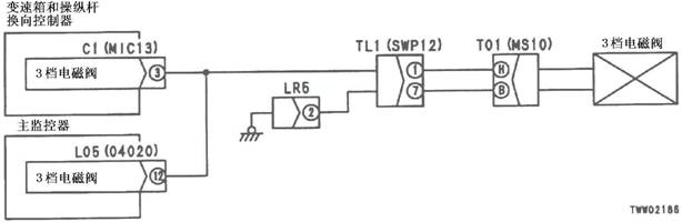 1)3檔電池閥故障 2)變速箱和操縱桿控制器C1(雌)(5)-TL1(3)-T01(F)之間線束與電源短路,與機箱接地短路,觸點有故障或斷開 3)機箱-TL1(7)-T01(B)之間線束與機箱接地短路,觸點有故障或斷開 4)變速箱和操縱桿控制器有故障 | ||||