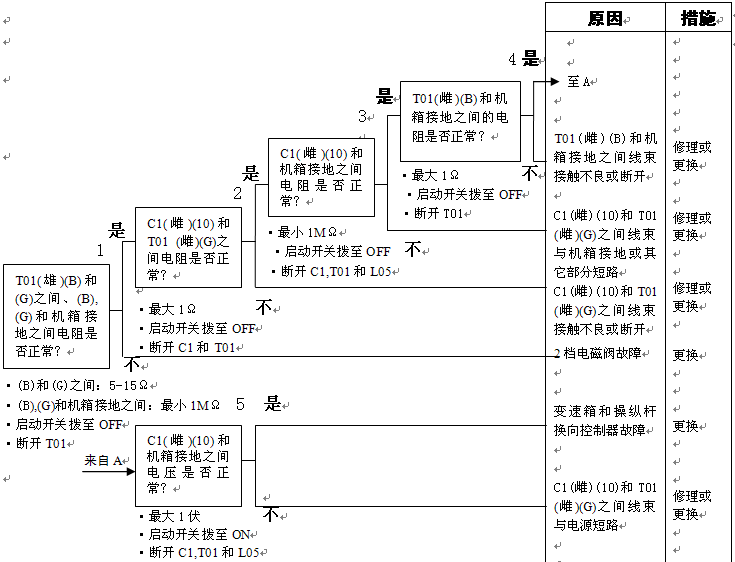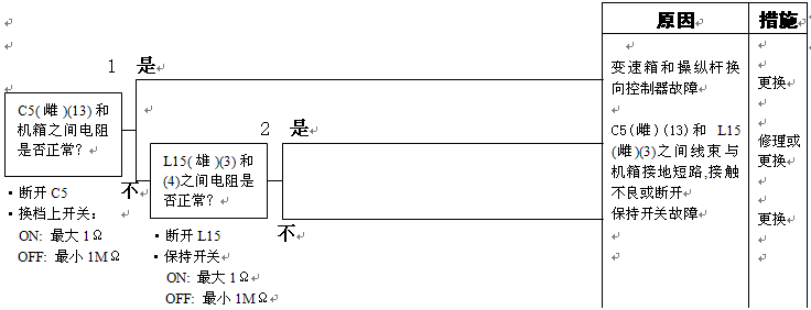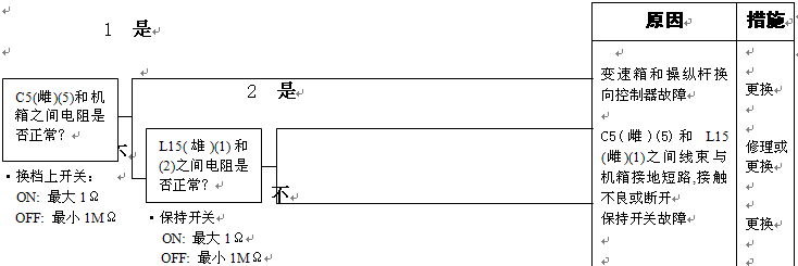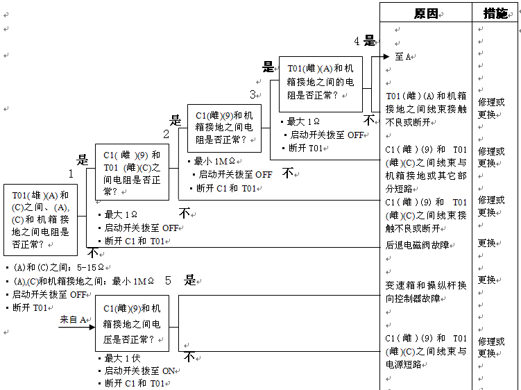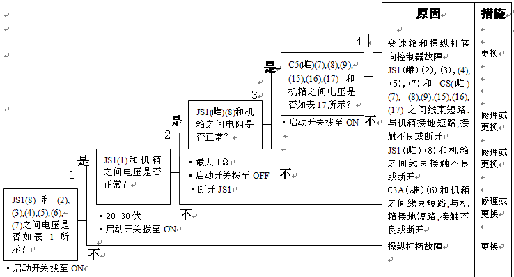 1)變速箱和操縱桿控制器C1(雌)(3)和機箱接地之間的電阻:5-15Ω 2)變速箱和操縱桿控制器C1(3)和機箱接地在空擋時的電壓:小于1伏 |