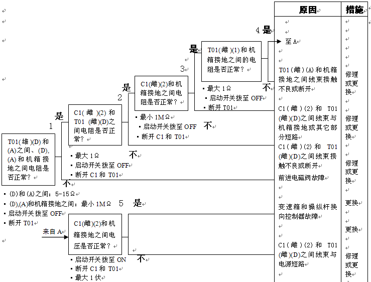 1)變速箱和操縱桿控制器C1(雌)(11)和機箱接地之間的電阻:5-15Ω 2)變速箱和操縱桿控制器C1(11)和機箱接地在空擋時的電壓:小于1伏 |