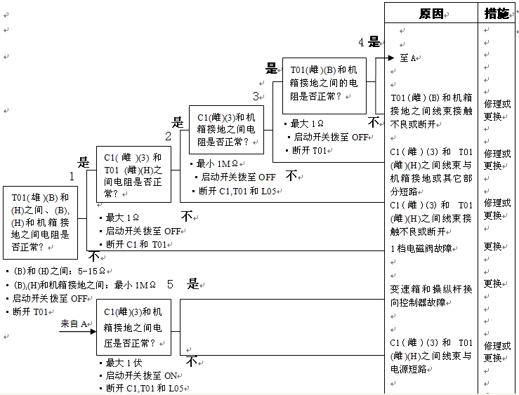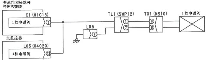 1)1檔電池閥故障 2)變速箱和操縱桿控制器C1(雌)(3)-TL1(1)-T01(H)之間線束與電源短路,與機箱接地短路,觸點有故障或斷開 3)機箱-TL1(7)-T01(B)之間線束與機箱接地短路,觸點有故障或斷開 4)變速箱和操縱桿控制器有故障 | ||||