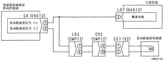 1)發動機速度傳感器E07(1)和(2)之間的電阻:100-500Ω 2)變速箱和操縱桿控制器C4(雌)(2)和(9)之間的電壓 |