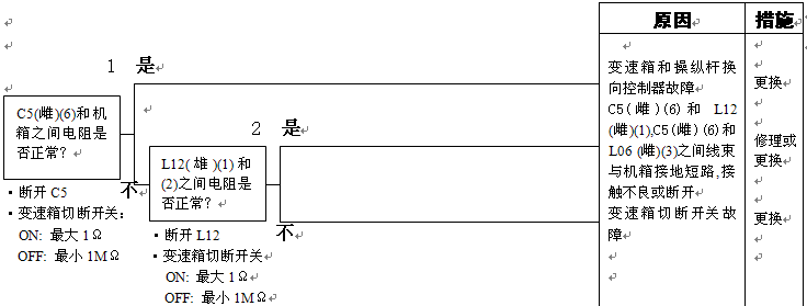 1)方向桿故障 2)組合開關電源故障 以下線束與電源短路,與機箱接地短路,觸點有故障或斷開: 3)變速箱和操縱桿控制器C3B(雌)(7)和L04(5)之間線束 4)變速箱和操縱桿控制器C3B(雌)(15)和L04(6)之間線束 5)變速箱和操縱桿控制器C3B(雌)(8)和L04(7)之間線束 6)變速箱和操縱桿控制器C3B(雌)(16)和L04(8)之間線束 7)變速箱和操縱桿控制器故障 |