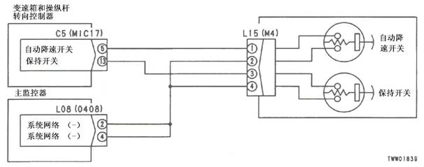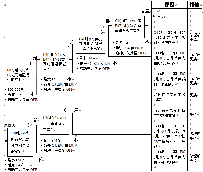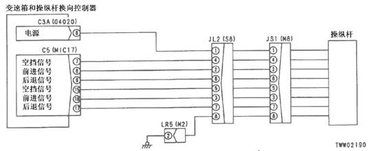 1)方向桿故障 2)組合開關電源故障 以下線束與電源短路,與機箱接地短路,觸點有故障或斷開: 3)變速箱和操縱桿控制器C3B(雌)(5)和L04(2)之間線束 4)變速箱和操縱桿控制器C3B(雌)(13)和L04(3)之間線束 5)變速箱和操縱桿控制器C3B(雌)(6)和L04(4)之間線束 6)變速箱和操縱桿控制器故障 |
