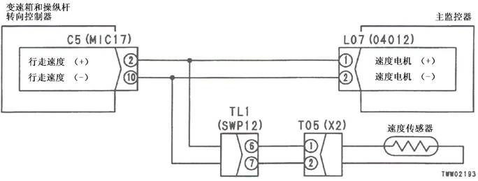 1)速度傳感器故障 2)速度傳感器安裝調整故障 3)變速箱和操縱桿控制器C5(雌)(2)-TL1(11)-T05(1)間線束觸點有故障或斷開 4)變速箱和操縱桿控制器C5(雌)(10)-TL1(12)-T05(2)之間線束觸點有故障或斷開 5)變速箱和操縱桿控制器有故障 |