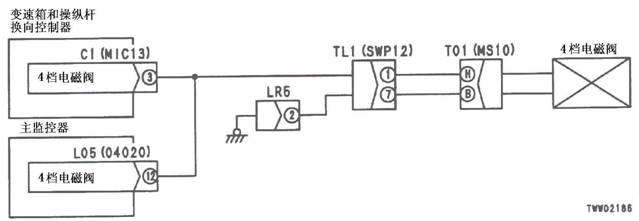 1)4檔電池閥故障 2)變速箱和操縱桿控制器C1(雌)-TL1(4)-T01(E)之間線束與電源短路,與機箱接地短路,觸點有故障或斷開 3)機箱-TL1(7)-T01(B)之間線束與機箱接地短路,觸點有故障或斷開 4)變速箱和操縱桿控制器有故障 | ||||