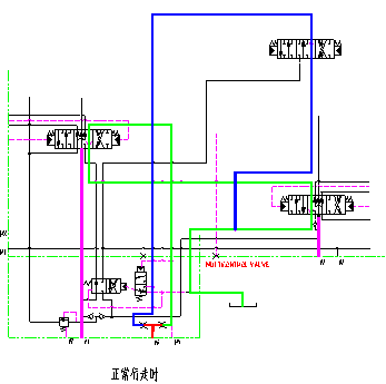 當行走操作閥動作時,PG左側節流后的油的回油通道被關閉,油壓上升,使SQ閥往下移動,此時若有其它動作時,PG右側節流后的油的回油通道被關閉,油壓上升,使TS閥往左移動,如下圖,這樣P2泵的油通過TS閥給左右行走供油,P1泵給其它動作供油。