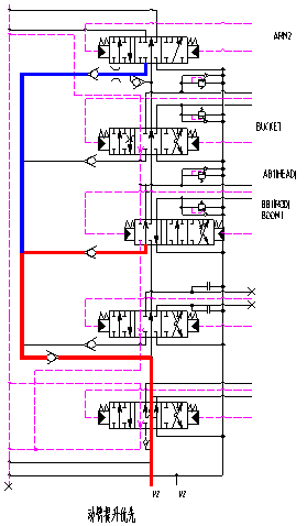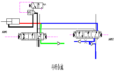 斗桿合流是通過ARM2閥把泵2的流量引到斗桿大腔或小腔,實現合流。