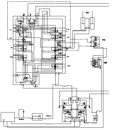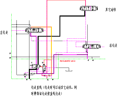 1.2.3行走直線功能,當挖掘機陷入坑中或其它特殊工況時,要求挖掘機能邊行走邊動工作裝置(動臂、斗桿、鏟斗、回轉),能實現挖掘機的自救或其它功能,其工作原理如下: