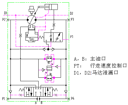 當閥處于中位時,P1,P2通過閥的中位油道,最后經過NR1,NR2節流后回油箱,在節流口NR1,NR2前取得壓力信號FL,FR,就可以控制主泵到最小排量。