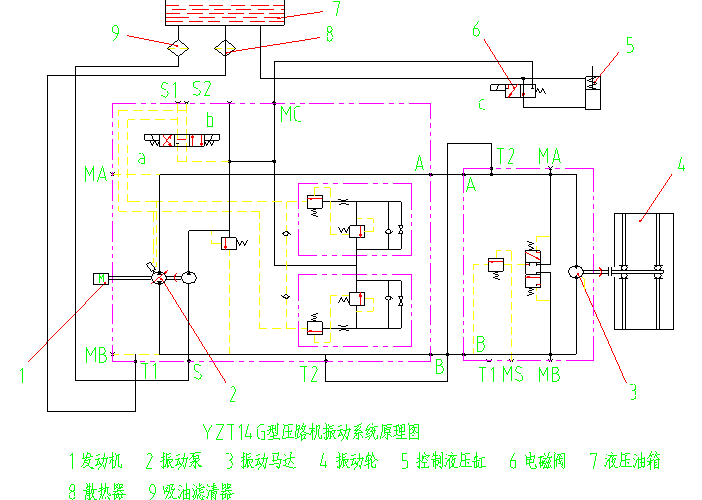 由附圖可知,振動(dòng)泵2把發(fā)動(dòng)機(jī)飛輪輸出的機(jī)械能轉(zhuǎn)換成高壓油液的壓力能,再通過接頭、膠管等輔助元件傳遞給振動(dòng)馬達(dá)3;振動(dòng)馬達(dá)3把高壓油液的壓力能轉(zhuǎn)換為機(jī)械能,而后通過聯(lián)軸節(jié)驅(qū)動(dòng)振動(dòng)軸旋轉(zhuǎn),使振動(dòng)輪產(chǎn)生振動(dòng)。通過控制元件——三位電磁換向排量控制閥a和b的作用,振動(dòng)泵2可以截止或改變高壓油流的方向,從而實(shí)現(xiàn)振動(dòng)馬達(dá)停止旋轉(zhuǎn)或改變其旋向,使振動(dòng)輪停振或?qū)崿F(xiàn)大、小振幅的振動(dòng):當(dāng)電磁閥a和b均不帶電時(shí),振動(dòng)馬達(dá)不旋轉(zhuǎn),振動(dòng)輪不振動(dòng);當(dāng)電磁閥a帶電時(shí),振動(dòng)馬達(dá)為順時(shí)針方向旋轉(zhuǎn)(從馬達(dá)軸端面看),振動(dòng)輪內(nèi)大小偏心塊的質(zhì)量偏心矩疊減,變成小振幅振動(dòng)。