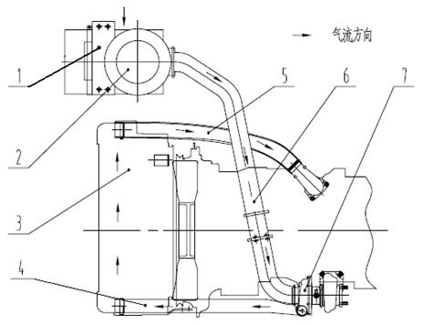 1-空濾支架 2-空氣過濾器 3-中冷器 4、5、6-進氣管 7-渦輪增壓器
