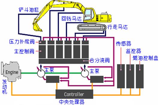 液壓挖掘機的動力裝置是由發動機、散熱器、連軸器及輔助元件組成。它主要是發動機和五大系統組成,如下圖所示: