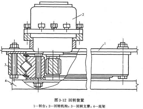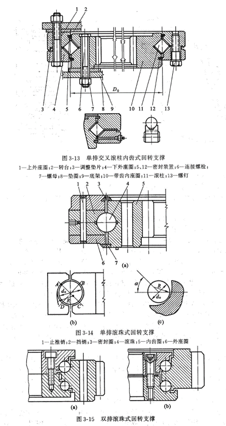 單斗液壓挖掘機用回轉支撐的結構型式,實現上部平臺的回轉,回轉支撐按結構形式分為轉柱式和滾動軸承式等兩種,見圖3-13、圖3-14、圖3-15。