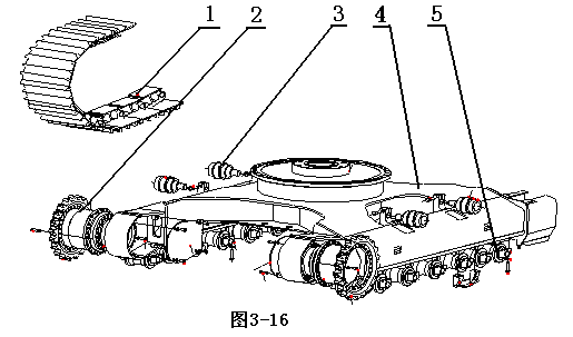 1-履帶;2-行走馬達及驅動輪;3-托鏈輪;4-X型車架;支重輪