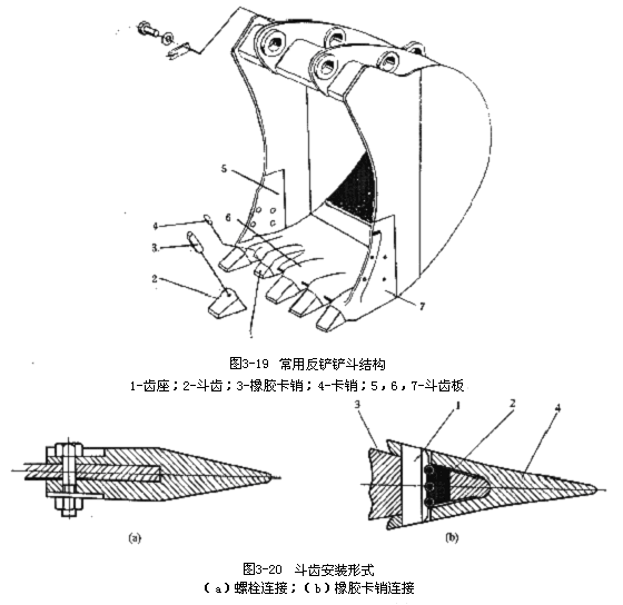 反鏟用的鏟斗形狀、尺寸與其作業對象有很大關系。為了滿足各種挖掘作業的需要,在同一臺挖掘機上可配以多種結構型式的鏟斗,見圖3-19、圖3-20分別為反鏟用鏟斗的基本形式和常用形式。鏟斗的斗齒采用裝配式,其形式有橡膠卡銷式和螺栓連接式,如圖2-5所示。