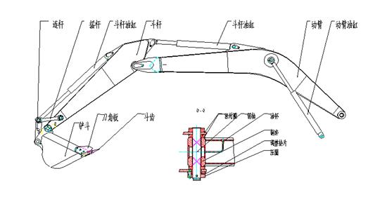 整體式動臂的優點是結構簡單,質量輕而剛度大。其缺點是更換的工作裝置少,通用性較差。多用于長期作業條件相似的挖掘機上。整體式動臂又可分為直動臂和彎動臂兩種。其中的直動臂結構簡單、質量輕、制造方便,主要用于懸掛式液壓挖掘機,但它不能使挖掘機獲得較大的挖掘深度,不適用于通用挖掘機;彎動臂是目前應用最廣泛的結構型式,與同長度的直動臂相比,可以使挖掘機有較大的挖掘深度,但降低了卸土高度,這正符合挖掘機反鏟作業的要求。