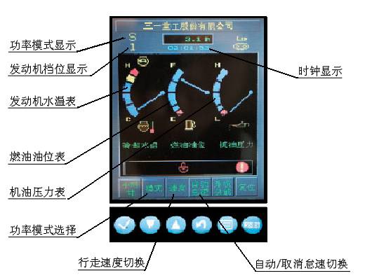 自動(dòng)怠速有效,即在顯示屏上提示為“自動(dòng)怠速”。當(dāng)系統(tǒng)液壓操縱桿回中位時(shí)間超過(guò)8秒后,PLC自動(dòng)減少發(fā)動(dòng)機(jī)油門開度,使發(fā)動(dòng)機(jī)在1250轉(zhuǎn)/分運(yùn)轉(zhuǎn);當(dāng)扳動(dòng)操縱桿重新作業(yè)時(shí),PLC立即控制發(fā)動(dòng)機(jī),使它迅速恢復(fù)到設(shè)定的工作速度。或通過(guò)右手柄中間的按鈕可由高速降到1250轉(zhuǎn)/分或由1250轉(zhuǎn)/分上升到顯示的檔位速度。可起到節(jié)能和降低噪聲的作用。
